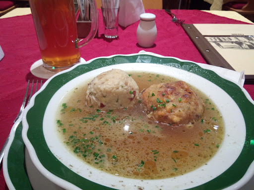 We both ordered soup with a dumpling for starters, and they were delicious. Clear but tasty beef consomme with a huge, stodgy but flavoursome dumpling in the bowl - speck (bacon) for me, cheese for Clare. We hadn't actually even finished these before the waiters rocked up with our main courses. Clare had a schnitzel which looked every bit as good as the one I'd had the night before (but a lot cheaper), while I went for the roast pork, sauerkraut and yet another gargantuan dumpling. The main courses were every bit as tasty as the starters, but so big. So...