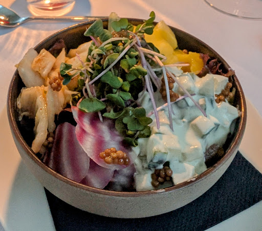 Read moreA lovely restaurant. We were seated in their covered outdoor space. Service was excellent, being flexible to get us information, suggesting a half portion and checking in. We started with a half portion of a creative salad. For the main, I had the perch fillet. Very creatively prepared and the fish was a large piece perfectly cooked. My wife had the seasonal pasta. A nice dish but not outstanding... A large portion that became monotone. This is the only reason I give the food a four rather than a five. There were several half bottles of wine available, which is always nice. I...
