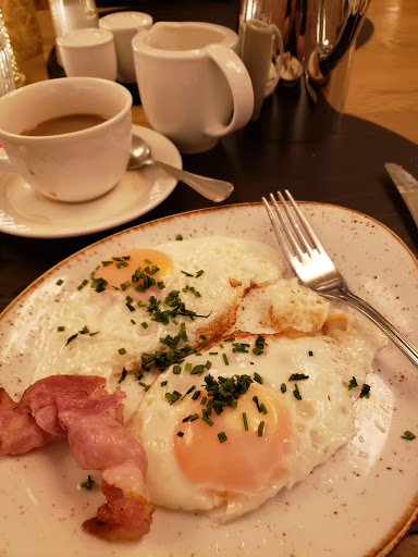 Last night's dinner at the restaurant downstairs was delicious: I opted for the tradional weinerschnitzel with potato salad...and though it was good, it's the breakfast that really stands out. I always feel ridiculous taking pictures of food, but in addition to last night's weinerschnitzel glamor shot (attached lol) I sneaked a picture of the eggs prepared for breakfast.