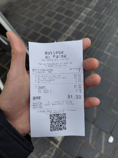 Read moreDO NOT GO THERE Me and 2 of my friends were coming back from Germany and stopped in Innsbruck because we wanted to visit the city. It was 2pm and the only open restaurant was this one; I usually avoid Italian restaurants outside Italy but we let it slide. The guy started to befriend us because we are Italians and offered to sit us down and give us some bruschette and one plate of cooked vegetables to share (in Italy this would probably cost about 20€ total, especially in a bottega kind of restaurant. We ordered also 2 bottles of water and 1 bottled beer. The water came out to 3.5€ each (for 0.5l), the bruschette cane out to 16€ each and the plate of vegetables (with the most disgusting price) was 31€!!!!!!! Also he offered us ONE plate of vegetables and in the "receipt" (if we can call it that, paid all cash) there were signed two portions... This guy brings a bad reputation to foreign countries about Italy, it really sucks to see people being apparently friendly and then scamming people. Italy is about being honest and offering, this guy is none of the above. Very very very disappointed and also angry because we threw away 30€ each for some food that really didn't fill us up. Price is not justified when you can drive 1 hour at the border and eat the same things for less than half of the price. Also the bottega Is called "Bottega di Parma" and he Is nowhere close to Parma. Classic south Italian...
