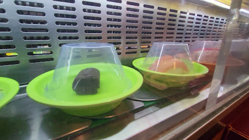 Unten im kalten Bereich des Bandes fehlte eine Beleuchtung und die Plastikabdeckungen waren schon sehr mitgenommen und eingerissen, so konnte man nur erahnen, was man sich da nimmt. Das Sushi war genießbar, mehr auch nicht. Aber das meiste andere war eingetrocknet und alt!