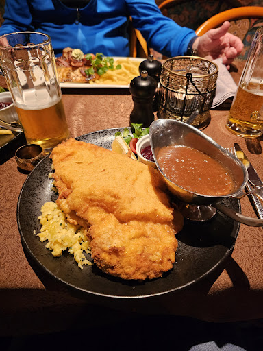 Pizzas and schnitzel mostly done reasonably well. They are very tight on the wine portions. I was sympathetic for the one rushed girl trying to serve everyone. Natural she forgot a few things. We saw a few tables complaining about various things or returning plates barely touched. My wife got an pepper so spicy she was in real pain and asked for a glass of milk. Surprised we had to pay for that. 7 euros for a bottle of water. Ski...