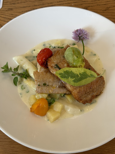 Welsfilet mit Erdäpfel-Spargel Ragout: Große Portion im tiefen Teller serviert, zwei Stücke Wels, auf einem Ragout aus fein gewürfelten Erdäpfeln und Stücken vom weissem Spargel. Der Fisch in Topqualität am Punkt gebraten, Spargel und Erdäpfel in perfekter Konsistenz, und nicht zu einem Brei verkocht, glasierte Tomaten, alles fein abgeschmeckt mit frischen Kräutern, Garniert mit Salbeiblatt, Schnittlauchblüte und einem Zweig frischem Thymian - ein Gericht zum Niederknien.