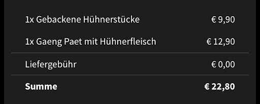 Read moreWir bewerten hier nur das Essen, nicht den Service oder Ambiente vor Ort, da wir uns das Essen über mjam nach Hause bestellt haben. Wir waren nicht zufrieden. Bestellt haben wir: 1x gebackene Hühnerstücke mit süß-sauer Sauce. (9,90€) Leider waren die gebackenen Hühnerstücke bereits in der Sauce getränkt, sodass vom knusprigen nicht mehr viel übrig blieb. Geschmacklich waren sie aber ok. 1x Gaeng Paet mit Hühnerfleisch. (12,90€) Dies war der totale Reinfall. In der Beschreibung wird „frisches Gemüse, Basilikum, Kokosmilch und rotes Curry“ versprochen. Davon war leider überhaupt nichts in der schmierigen Pampe, die wir erhalten haben, zu finden. Geschmacklich ein Totalausfall. Die Konsistenz und die Champignons mit dem Hühnerfleisch erinnerten an ein schlechtes Kantinen Frikassee, mit einer dicken Einbrenn. Wir bestellen dort definitiv nicht mehr. Der Reis war aber gut und hat uns letztlich noch gesättigt, den hätten wir uns aber auch selber...