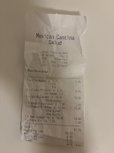 The burrito itself was decent, but when I ordered a Kaiserspritzer, she brought me a Hugo instead without asking me whether I was OK with that. Hugo, wasn’t a bad drink but it wasn’t what I asked for. The final straw was when I received the bill, and I noticed I was charged €6.50 when Kaiser normally is between 4 to 5 euros.. Although I rounded the bill to €27, being overcharged for a drink I didn’t order left a sour taste. Especially when I paid a premium amount for a burrito in a small city in Austria.