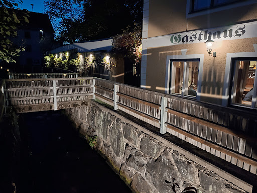 Very traditional old German building set in the heart of Knittlefeld, has a small river next to it, with pedestrian bridges to walk into the restaurant, very beautiful.