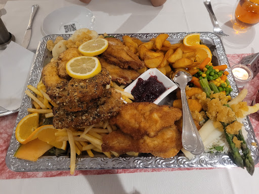 Oh my god, the schnitzel platter for two is huge! You can feed an orphanage with this. It has a selection of three schnitzels and a cordon blue, fries, potato wedges, rice, peas carrots and corn, asperges, rösti, cauliflower, jam and maybe more. Everything times two because it's for two persons. Delicious! Friendly staff and nice atmosphere. Sorry for my...