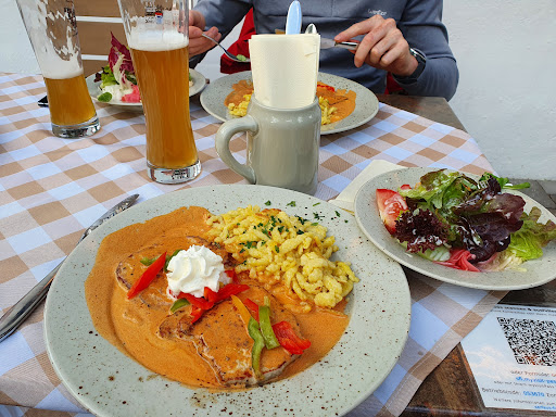 Read moreDie tollen Bewertungen haben uns angelockt, leider sind diese für uns nicht nachvollziehbar. Es gibt hier im Vergleich zu anderen Restaurants der Gegend lediglich durchschnittliches Essen und unterdurchschnittlichen Service. Beim Essen fiel uns ein (für uns zu) hoher Anteil fertiger Komponenten auf: die immer gleiche TK-Gemüsemischung als Beilage (auch auf all den Bildern ersichtlich, war mir vorher leider nicht aufgefallen), der Salat zu 70% aus fertigem Bohnensalat/Weißkrautsalat/Möhrensalat etc. und oben drauf ein paar grüne Blätter, TK-Pommes. Die Kindergerichte waren absolut lieblos angerichtet, habe dem Kind zum Schnitzel etwas vom TK-Gemüse abgegeben. Ein auf der Karte angebotenes Entrecote entpuppte sich als Rumpsteak, die Qualität war aber gut (trotzdem leider nicht was bestellt wurde). Die Servicekraft war freundlich, hatte aber keine Ahnung, weder vom Wein, noch von den Gerichten und der Umgang mit kritischen Nachfragen war unprofessionell. Als wir Nachtisch bestellen wollten, wurde erstmal kritisch auf die Uhr geschaut, gnädiger Weise durften wir noch bestellen. Da fühlt man sich doch als Gast willkommen. Fazit: Man kann hier gut bürgerlich essen und wird auch satt, ein besonderes kulinarisches Erlebnis ist das hier aber sicher nicht, da gibt es weitaus bessere Adressen in der Gegend (preislich nicht teurer). Das Ambiente und die Lage sind echt schön (das soll fairerweise nicht unerwähnt bleiben),...