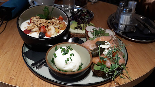 Read morenice place with a bunch of good breakfast options. interior design is rather modern, jus a bit dull for my taste, but still nice enough and definitely clean. staff is friendly and competent. good number of seats, so unless its busy hours you should be able to get seated. coffee and food is good (nice omelettes!), the people who come here are friendly too (communal greeting...
