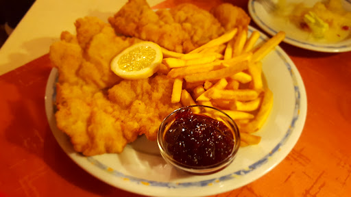 Schnitzel "Wiener Art" kam (sicher) aus der Fritteuse und ist in dieser Qualität an jedem Imbiss zu bekommen. Die dazu bestellten Bratkartoffeln trieften vor Öl, waren aber nicht mal angebraten. Wenigstens ein paar Zwiebelstücke hatten es in die Pfanne geschafft.