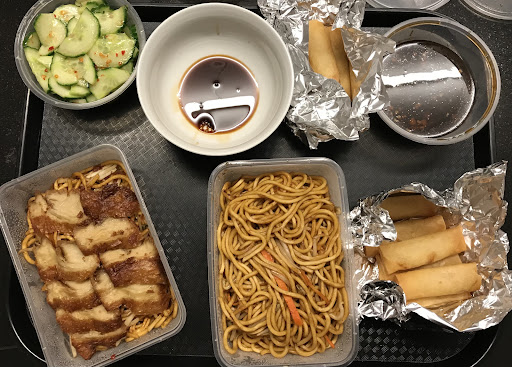 Geschmacklich alles sehr gut: Nudeln mit Gemรผse, Nudeln mit veganer knuspriger Ente (sehr lecker!), Veggie-Frรผhlingsrollen knusprig, Gurkensalat frisch und leicht scharf. ๐
