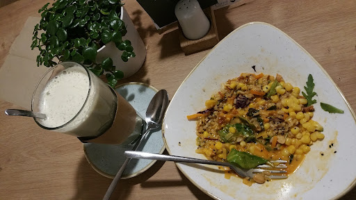 Read moreVor kurzem das Vegan Curry Bowl dort probiert. Eins fällt immer auf, die 2-3 Leute im vorderen Bereich sind häufig bis zum Anschlag ausgelastet, das kann sich sogar bei der Herausgabe des Wechselgelds negativ bemerkbar machen bzw. manche potentiellen Kundinnen gehen auch nach einer Zeit bevor sie bestellt haben. Laut Menü war das ein Red Thai Curry mit der angeblich höchsten Schärfestufe, das scheint aber eher am mitteleuropäischen Standard gemessen zu werden (als am Thailändischen). Zutaten sind Vollkornreis, Thai Curry, ein paar Erdnüsse, Salatblättchen, rohes Rotkraut und jede Menge Maiskörner. Gesund dürfte es sein, aber geschmacklich war es für mich eher lauwarm. Wer immer das zusammengestellt hat, dürften sich nicht die Frage gestellt haben, wie bringen wir es so hin, dass das auch nicht vegan lebende Leute das gern und wieder essen würden. Wer also wirklich veganes Curry haben möchte, das geschmacklich auch ein Erlebnis ist, wird wahrscheinlich bei einem der Linzer indischen Restaurants besser versorgt. Außerdem wer es gern wirklich scharf mag, sollte die Tabasco Sauce verwenden. Leider hab ich nur ein kleines Fläschchen vorne bei der Essensausgabe gesehen (auf den Tischen nicht). Alles in allem läuft anscheinend vieles (möglicherweise wegen der Franchisekosten) auf Sparflamme. Ich finde es zB überhaupt nicht schlimm, dass man sich das Essen selbst holt oder das Geschirr wegräumt, aber gerade dann sollte auch genug Personal da sein, um die Bestellungen zügig...