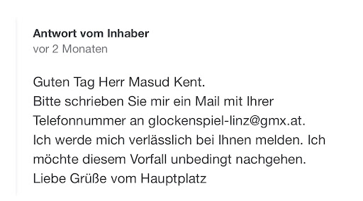 UPD: Nach der Antwort von dem Eigentümer dieses Lokals habe ich mich unverzüglich bei Ihm per Email gemeldet. Wie Er es mir gesagt hat habe ich meine Telefonnummer geschickt. Es wundert mich irgendwie nicht, dass ich weder von Ihm angerufen wurde, noch eine Antwort auf die Email bekommen habe. Es war mir klar, dass Er vor der Öffentlichkeit so auf hilfsbereit und...