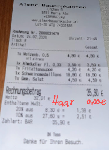 Nach einem langen Tag wollte ich mit meiner 12-jährigen Tochter noch etwas Essen gehen und stieß bei der Google Suche auf das Almer Bauernkastl. Es war kurz vor 21 Uhr und hatten nichts reserviert. Das Personal, sehr freundlich, verschaffte uns einen schönen Platz, der gerade frei geworden war. Bevor wir das Essen bekommen hatten, wurden wir freundlich gefragt, ob sie uns nochmal umsiedeln könnten, da eine Gruppe mit 5 Personen kommen würde. Ich sah darin kein Problem und wir landeten an einem anderen Tisch - mit 6 Plätzen!? Nun gut, wir bekamen unser Essen, Salat, Suppe und Schweinemedaillons. Es schmeckte alles sehr gut bis ich fast zwei von drei der Medallions und den Großteil der Pommes gegessen hatte. Ich spürte plötzlich etwas im Mund, das mich sofort an ein Haar erinnerte. Tatsächlich zog ich mit dem Stück Fleisch ein Haar aus dem Mund. Nun ekelt es mich wirklich sehr und ich konnte wirklich keinen Bissen mehr weiter essen. Nach einer Weile fragte der Ober, ob alles in Ordnung sei. Ich teilte ihm das Malleur mit und er meinte nur, das ihn ihrer Küche keiner Haare habe. Mit großer Verwunderung entgegnete ich nur, dass ich nicht weiß wo es herkommt, aber es war im Gericht. Ich muss dazu erwähnen, dass das Haar in seiner Länge ganz offensichtlich nicht von mir stammen konnte! Der Ober sagte nur noch, dass er es der Küche mitteilen würde und nahm das Gericht mitsamt dem "Beweisstück" mit. Einige Zeit verging ohne weitere Reaktion. Ich trank aus verlangte die Rechnung. Bezahlte dann mit ca. 10 % Aufschlag als Trinkgeld. Es kam kein Mensch mehr auf die Idee sich dafür zu entschuldigen oder irgend ein Zeichen des guten Willens zu zeigen! Es geht mir ganz sicher nicht darum, hier irgendwas abzuzocken und ich denke, dass sowas bei aller Vorsicht irgendwann auch mal passieren kann. Trotzdem würde ich gerne, zumindest ein ehrlich gemeintes Bedauern hören. Ich habe 1/3 des Fleisches und einige Beilagen zurück gehen lassen! Es ekelte mich sichtlich und egal wie locker es das Personal sieht, beim Service gehört es dazu, sich um einen Gast zu kümmern. Ich hatte keine Lust auf Diskussionen und machte im Lokal kein Aufhebens mehr darum. Ich fand es sogar sehr schade, denn ohne dieses Malleur hätte ich socher ebenfalls eine wohlwollende 5 Sterne Bewertung gegeben. Das Essen war gut und das Personal recht freundlich. Für mich war die Reaktionslosigkeit jedoch ein No Go. So darf das nicht ablaufen. So kann ich leider nun nicht anders, als meine Enttäuschung über diese Bewertung zum Ausdruck zu bringen und zu...