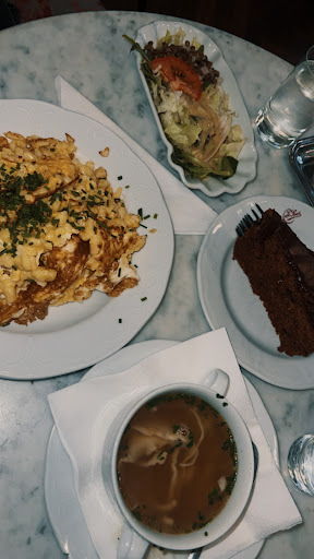 finally, we managed to order. the food came in a very odd order. firstly, the chocolate cake (sachertorte) came, before all the food. next, the eiernockerl mit salad and rindsuppe mit frittatas came. the eiernockerl was bland and tasted essentially like egg omelette. we had to add additional salt for it to taste like something at all. the rindsuppe was good but a really small bowl. we also ordered a melange, which was basically a mocha. but it came last, after all the food came, and we had to prompt the server to serve it before we came. worst mocha ever, tasted like a regular latte.