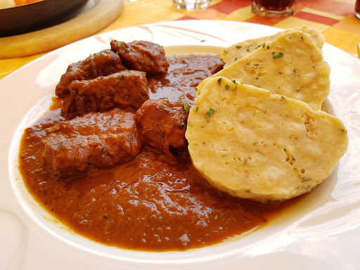 Schmackhaftes Essen: Curry-Kokos-Suppe um 4,90 €. Schmeckt nach Urlaub. Tagesangebot: Gulasch mit Serviettenknödel um 12,90 €. Tadelloses, mürbes Rind und gute Knödel. Lauteracher Pfännele um € 17,90 = Schweinefilet an Champignonsauce mit Knöpfle und Gemüse. Alles tadellos, wiewohl das knackige Gemüse etwas in Fett (von der nicht 100%ig gebundenen Sauce?) liegt. Nachdem wir ob der üppigen Portionsgröße nicht mehr können, fällt der Nachtisch aus. Aber dafür ist man ja hier bekannt....