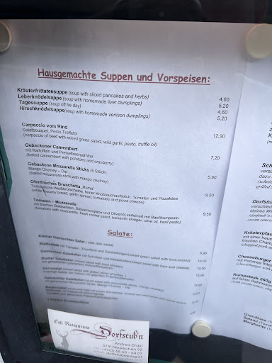 Read moreWir waren zum Abendessen im Dorfstub'n und saßen drinnen im landestypischen Gastraum. Wir hatten Cheeseburger, Pfifferlingomlett und Pizza mit Spinat und gegrilltem Kürbis bestellt. Die ersten beiden waren in Ordnung, Aufschlag für Süßkartoffelpommes statt Pommes 3 Euro. Die Pizza kam einer Tiefkühlpizza gleich. Auf unsere Nachfrage hin wurde dies bestätigt. Es ist zwar nicht verboten Tiefkühlprodukte anzubieten, jedoch erwartet der Gast in einem Restauran niemals eine aufgewärmte Tiefkühlpizza. Und dann dafür 14,50 Euro zu nehmen ist eigentlich eine Frechheit. Da die Bedienung unsere Kritik gehört und auch mitbekommen hat, dass wir ein Gebutstagskind dabei hatten, gab es später noch ein Schokoküchlein mit Eis aufs Haus. Daher fällt die Gesamtbewertung nicht ganz so schlecht aus. Wir würden aber empfehlen, die Tiefkühlpizza von der Karte zu nehen, das ist eines Restaurans...