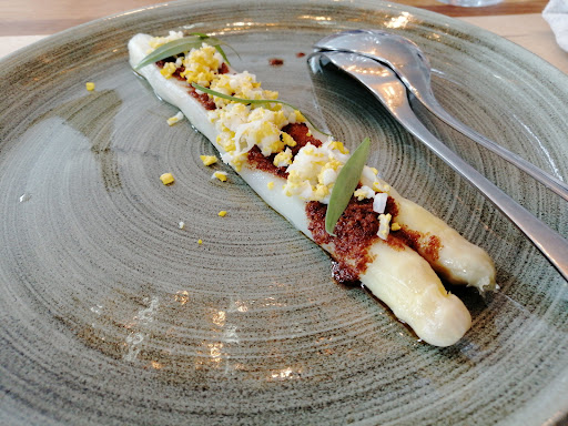 Der Hauptgang folgt in zwei Wellen: Spargel mit Brösel und Entenei, Schleie mit kleinen Kartoffeln und Caesar-Dressing. Danach Verschiendenes vom Wagyu-Rind (Faschiertes, Brust und Szegediner Gulasch), Ochsenschmorbraten auf Belugalinsen, Spätzle, Mangold, Frühlingszwiebel. Der Spargel ist das Highlight, das Faschierte extrem geschmacksintensiv. Alle Speisen sind tadellos zubereitet. Ob es das selbstgemacht Brot zum Start, der lose Zucker in der Schale oder die Milch im gläsernen Kännchen ist: Nachhaltigkeit ist als Prinzip spürbar. Wie wir finden eine ausgezeichnete Idee, die Spannung bringt, wenn man es denn...