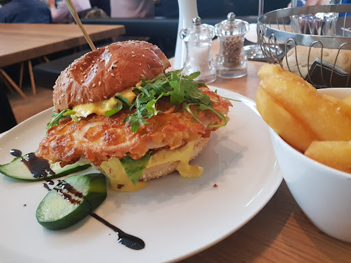 Das Speisenangebot ist innovativ, aber nicht Schickimicki. Neben der regulären Speisekarte mit Wraps, Burger und Klassikern gibt es auch eine saisonale. Beides lädt zu kulinarischen Reisen ein. Los geht es in der Steiermark (mit einem Vorarlberg-Beitrag): Kürbis-Mostapfelsüppchen mit Hühner-Ananas-Stick um 5,80 €. Sieht gut aus und schmeckt auch so. Von der Süße der Ananas über die Säure der Äpfel bis hin zu einer leichten Schärfe ist alles vertreten. Weiter in die USA: Crunchy-Burger um stolze 15,90 €. Er ist sein Geld wert, sowohl qualitativ als auch quantitativ. Sämige Currysauce, knusprig frittiertes Hähnchen, dazu ein frischer Bun und Rucola.