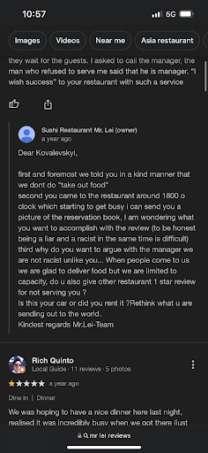 Exceeded all expectations! The interior is very cozy, everything's very clean, the utensils are stylish. We didn't make a reservation in advance (even though we should have: the place is popular, and for a good reason), but the administrator was kind enough to find a great table for two of us. The food is just delicious: we tried rolls, curries, jasmine tea and Japanese beer. Everything was brought fast and was absolutely delicious. The main thing I want to highlight is service. The waitresses are very kind, helpful and friendly - even to one another - which creates an unforgettable experience. But the best part was when we finished the dinner and were smoking outside. One of the waitresses (who didn't even serve us) happened to be outside, too. We started a conversation with her to say how much we liked the place. She was very friendly to us, invited to visit Mr. Lei once again, brought us a card with contact information and explained all reservation and takeaway options. I was impressed with how much she loves the place she works for, how inspired she was to talk about it and advertise it. The fact that regular employees are ambassadors of the place says a lot to me. Keep up the great work and thank you for...