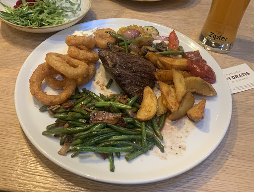 Besonderes Merkmal: Vom "Zuspeisen"-Buffet darf man sich mitunter so viel nehmen bis man wirklich satt ist [bitte maĂvoll nutzen, damit es auch so bleibt.. ;) ]. Wobei diese "Zuspeisen" durchaus ein eigenes Hauptgericht sein könnten (Tintenfischringe mit Wedges zum Beispiel). Wo man also bei anderen Restaurants dieser Kategorie und QualitĂ€t regelmĂ€Ăig mit der Angst bestellt, dass man nach so einem 200g Steak immer noch hungrig dasitzt, kriegt man hier eine "Sattheits-Garantie" mitserviert.