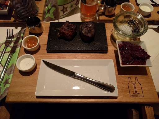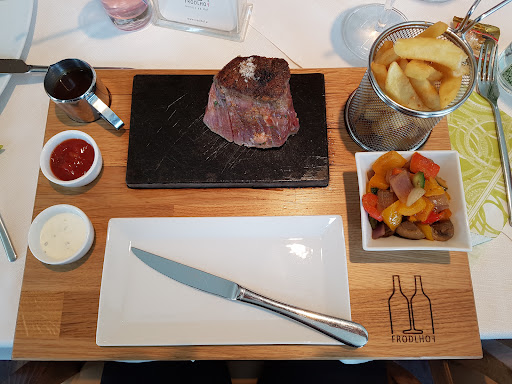 Ich war bereits mehrmals im Zuge von Großveranstaltungen beim Frodhof essen und die Speisenqualität sowie das Ambiente am Tisch (Saal) sind angesichts der hohen Preise meiner Meinung nach eher als unterdurchschnittlich zu bewerten. Bei der Veranstaltung "Menütheater" bezahlte man gestern stolze 78 Euro für ein 4-Gänge Menü im Rahmen der "Chaos-Kellner-Show" und entsprechend setzt man höhere Erwartungen. Weder das Showprogramm, noch das Essen mit Massenabfertigung in Kantinencharakter rechtfertigen jeweils die Hälfte des Preises. Lieblos werden ohne viel (auch finanziellen) Aufwand die Menügänge am Teller präsentiert. Für die Auswahl des Hauptganges erhält man eine große färbige Karte am Tisch, als ob der Gast unmündig ist, sich den bestellten Gang zu merken Das zerstört jegliches feierliches Ambiente! Angesichts der langen Wartezeiten (Bsp. Hochzeiten, Weihnachtsfeiern) ist das dann aber wieder nachvollziehbar :-) Speisen optisch ansprechend garniert? Deko oder Kerzen am Tisch? Alles leider Fehlanzeige! Die Speisen - zumindest Suppe und Saucen - hatten geschmacklich Fertiggericht -Chrarakter und für mich sind somit die positiven Bewertungen nicht nachvollziebar, würde ich im Vergleich zu anderen Gastwirtschaften im Umkreis keine 20 Euro für alle 4 Gänge in maximal "Standardqualität" ausgeben. Andere Gäste haben und werden dies - zumindest für diesen Abend - bestätigen! Obendrein hatten wir zu Viert Eintrittskarten (Nr. 30 ff!) schon vor Monaten gekauft und wurden dann aufgrund des chaotischen Reservierungssystem im Saal ganz hinten an einen spontan angestellten, ungedeckten Tisch auf die miserabelsten...