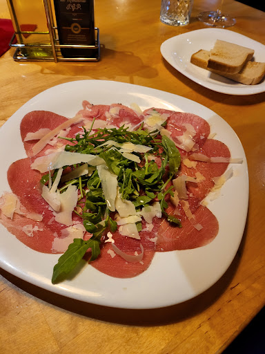 Hatten als Vorspeise Carpaccio und zur Hauptspeise einen Salat, eine Pizza Frutti di Mare und eine Pizza Schinken, Salami und Champignons.