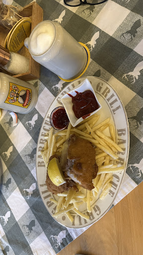 Das Cordon blue meines Mannes war in Ordnung. Mein griechischer Bauernsalat kam ziemlich unmariniert auf den Tisch, die wenigen Oliven waren in Scheibchen geschnitten, der Salat war aber grundsätzlich in Ordnung und auch reichlich. Der Feta war gut und ebenfalls angemessen.