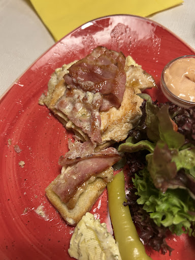 No cóż...zdarza się czasem że pójście do knajpy jest niewypałem. Tak było w tym przypadku. Zamówiłem pizze, którą formą i smakiem przypominala najlepsze pizze mroźone a'la Dr.Oetker, na stół wjechała też zupa czosnkowa z przetopionego serka topionego i śmietana na wierzchu. Nasz kardiolog padł by pod stól jak by ją zobaczył. No i prawdziwe must to eat czyli tzw. Sznycel. Skonsumował go mój nastolotni syn który na pytanie czy mu smakowało powiedział że ok. Ale dla nastolatków w tym wieku jedynym kryteriom oceny jest taka ilość potrawy która najlepiej żeby wylewała się poza talerz. Nie skonsumujesz tu niestety swojego wiktu. My za wyciągnięcie termosu mało co nie zostaliśmy spaleni na stosie. Obsługa w środku miła chociaż mało ogarnięta. Natomiast przestrzegam przed jakimkolwiek kontaktem z kelnerka obsługująca na zewnątrz. Kontakt grozi nerwem i uszczerbkiem na zdrowiu...