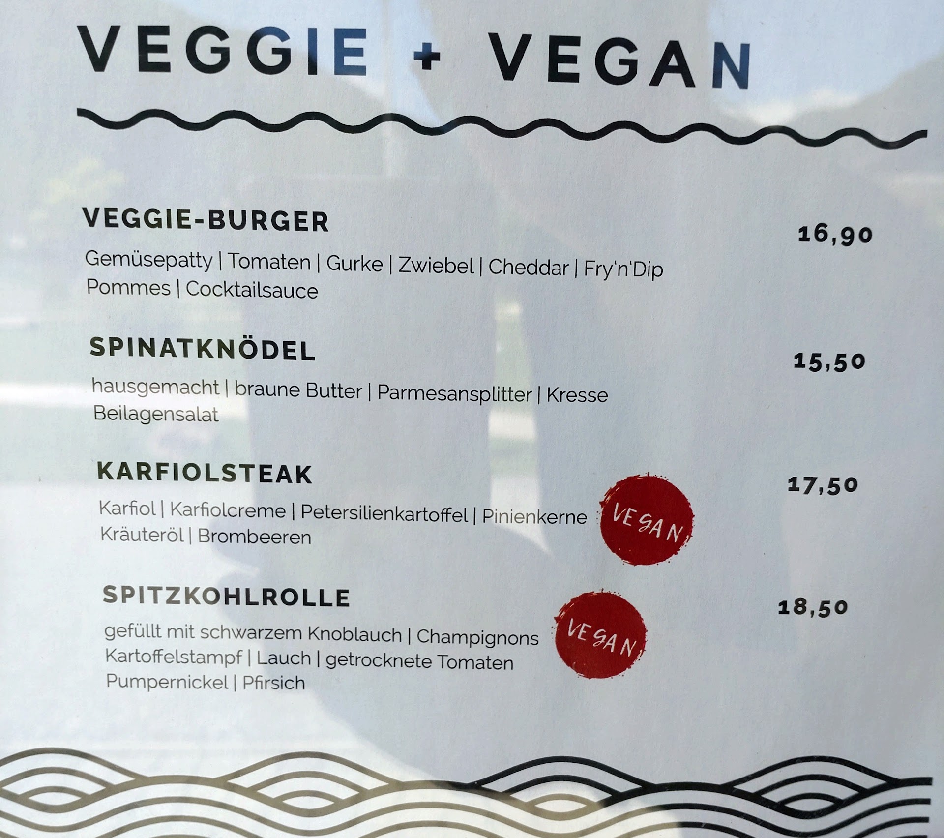 Wir waren an zwei Tagen dort zum Essen (gestern Abend zum Abschluss des Aufenthaltes und weil es so gut war, sind wir bei der Abreise noch zum Mittagessen eingekehrt) Die beiden veganen Gerichte sind wirklich sehr zu empfehlen - sehr schmackhaft und raffiniert miteinander kombiniert. Selten sowas gutes und veganes gegessen - großes Lob an die Küche. Auch schön, dass keine Ersatzprodukte (hoch verarbeitete "Nuggets", "Filetstreifen" oder ähnliches) auf dem Teller gelandet sind, sondern was richtig gekochtes. Service war an beiden Tagen in Ordnung, Sehr toll fand ich es, als ich nach dem Dressing bei dem Beilagensalat gefragt habe, dass die Kellnerin extra nochmal nachgefragt hat, ob es ohne tierische Zutaten zubereitet wurde. Eis gab es an beiden Tagen auch (zwar leider nicht vegan, aber bei den vorherigen Rezessionen wurde dies bemängelt) Einmal abends 19:00 Uhr bis 21:00 Uhr waren wir dort und am nächsten Tag um 12:00 Uhr mittags.