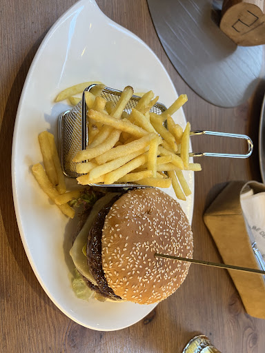 Wir haben die Terrasse betreten und gefragt, ob wir draußen essen können, was bejaht wurde. Anschließend haben wir den Kellner für 15 Minuten nicht mehr gesehen. Anschließend hat sich meine Frau für einen Veggie Salat (16€) und ich mich für den Beef Burger (17€) entschieden. Nach knappen 10 Minuten stand das Essen bereits vor uns. Der Salat bestand aus 2 Stück Melone und 2 Stück convenience Camenbert mit ein wenig Blattsalat. Mein Burger kam mit klassischen McDonalds Pommes. Das Bun war die einfachste Variante, die der Großmarkt zu bieten hat. Das Fleisch war leider auch ein klassisches Tiefkühlprodukt.