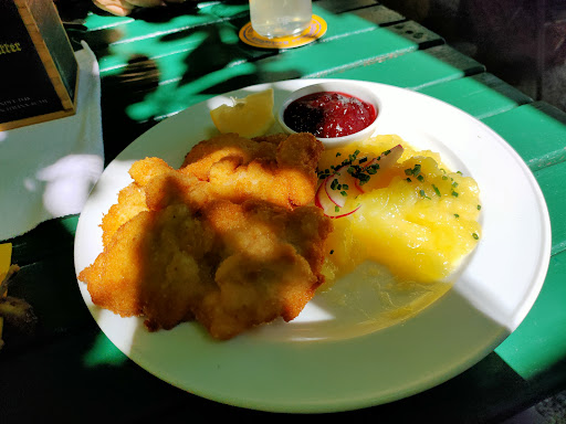 Read moreWe visited here for an early lunch on a Saturday in June. We ordered beer, the Goulash and a Wiener Schnitzel. Both food and the beer were really delicious. The food was hot and fresh and promptly served. The wait staff were friendly and efficient. The terrace was quite quiet, but as there were a couple of people smoking, we chose a table far away in the corner. We didn't ask, but it seemed that all the tables had ashtrays and there was therefore no 'No Smoking' area. Even with only a slight breeze, we were bothered by the smoke. By the time we left, the terrace was almost full, so I suggest you get there early, or reserve a table. The tables and chairs are pretty functional (think Bierkeller more than luxury restaurant); a few cushions are scattered around to help with comfort. Overall, a great lunch and recommended. We will...