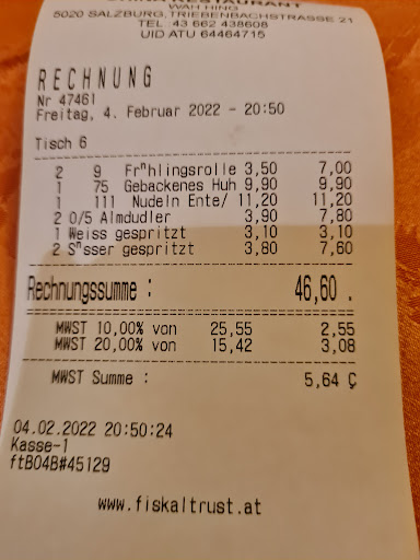 Food was good. The taste had been customised to more western taste, not original anymore. My European husband liked the noodles with crispy duck. Very good. I had chicken with mu-er (wood ear mushrooms), taste very mild, but still good. My husband liked them and finished them all, overall food were ok. Place was clean and service was good. And they’re open on Sunday (most places close on Sunday in Salzburg). White wine was very nice. Staffs and owners were so friendly and...