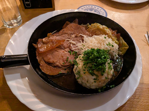 Food. Best semmelknoedel we have experienced over 4 days. Pork and the crackling was on point. Cheese dumpling soup was a pleasant surprise. My daughter was upset there was no schnitzel on the menu but quickly forgot her woes after tasting the paprika chicken and spatzle (amazing). Service. Prompt, polite, great English. Didn't have to want for anything. Tip - make a.booking. we were lucky at 6pm to get 80min at a table before the reservation arrived. Atmosphere. Authentic cellar. Not crammed in. I've deducted a point as our table looked into the kitchen. Whilst it's great to watch the chefs at work, we also saw the open supply closets and access points, and brighter lights that differed from other parts of the restaurant. Toilets very...