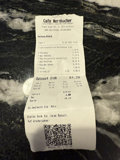 It was a very weird experience having breakfast here. We made reservations but to be honest, I don’t think makes a difference because they don’t reserve the tables. We sat at the table next to the door, I wasn’t a fan because it was cold but the only other option had two small chairs with no back and a small love seat and we were a party of three so we stayed at the corner by door table. We ordered drinks then food, and the man who I believe is the owner said our meals came with drinks, fine. Ordered the three egg dishes with one of them with an additional egg (with coffee/chai drinks) and one of the pancakes. Also I asked for tap water for the table. When the coffees arrived, I see they came with small individual water classes and then one big class of the “ordered” tap water. First came out the pancakes, then minutes after another egg dishes, few minutes later two eggs, and then minutes later the other two egg dishes. I then realized that he misunderstood because now we had three eggs instead of the preferred one extra, fine. It wasn’t easy to get their attention because it was just two of them working and a full house. Fine. The food was decent, nothing crazy to write home about. The coffee drinks were our favorite. The pancakes, didn’t come with honey or syrup which in the menu states it does. I then realized he forgot to ask which I wanted. I asked the woman for syrup to which she returned with it saying here’s your extra syrup. I was thinking, why extra if it states in the menu it comes with one of the two options. When the bill came I was surprised to see that not only was there an extra charge of 1€ for the syrup but that the pancakes were 8.20€ instead of 7,90€ as stated on the menu. I didn’t notice this until after we paid because she didn’t show us the bill beforehand just stated the total. To be honest, we weren’t the happiest with the overall experience so when we gave the card to pay and she asked if we wanted to give a tip, it was a bit odd, if we wanted to tip we would and I would prefer to do it on our own accord. Anyhow we gave 3€ tip. When I noticed these extra two charges, as well as a charge for the tap water being 1,20€ I was annoyed because, since when do you charge for tap? I could go to the bathroom and drink the water there if I wanted to, since all tap in Austria comes from every faucet. It’s not bottled water. When I asked the woman server about the extra pancake charge she was aggressive in telling me I ordered banana pancakes, as I told her, no I didn’t I simply ordered the pancakes which state with honey or syrup with whipped cream and fruit (banana seems to count as fruit). Then she also had no reply as to why the syrup was 1€ extra. When I inquired about the tap water she said, there is nothing for free. I asked to speak to the manager, or the owner, and she came back only with 1€ as retribution. I told her she could have been a little nicer and we left the change. I won’t be coming back and would not recommend if you would like a relaxing and enjoyable morning. It’s a shame as we liked their other location, but it seems this new venue is a bit too much for them to handle and it is not pleasurable to experience.