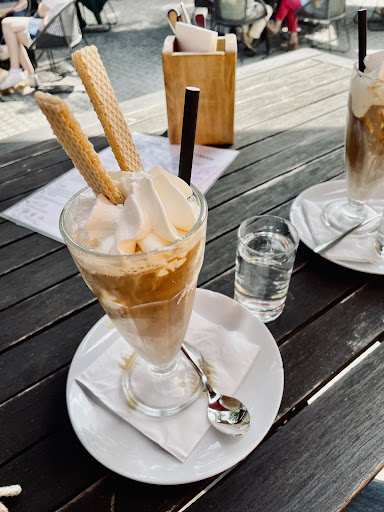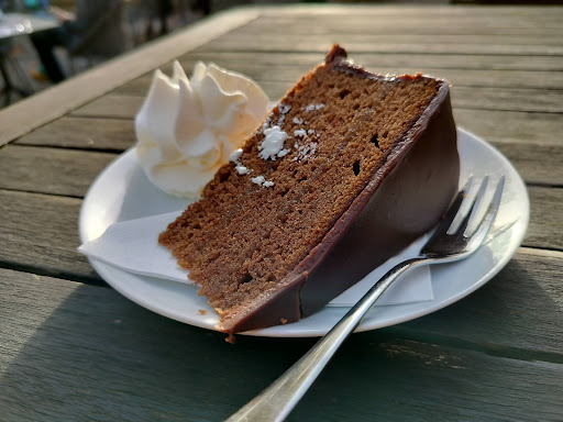 The cafe is in the beautiful grounds of the Helllbrunn Palace and has lots of outdoor seating, with some seating indoors as well. The service was very good. We got there at about 5:30pm and they had unfortunately already run out of a number of ice cream flavours. I got the last slice of chocolate cake, which was pleasant but unexceptional (I probably would have been better off with the apple strudel, which looked very good). The peppermint tea, however, was excellent, with lots of fresh mint...