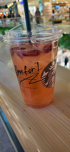 Mall Starbucks with spacious lobby. Many seats offer power outlets, some with USB charging ports for your phone or power bank.