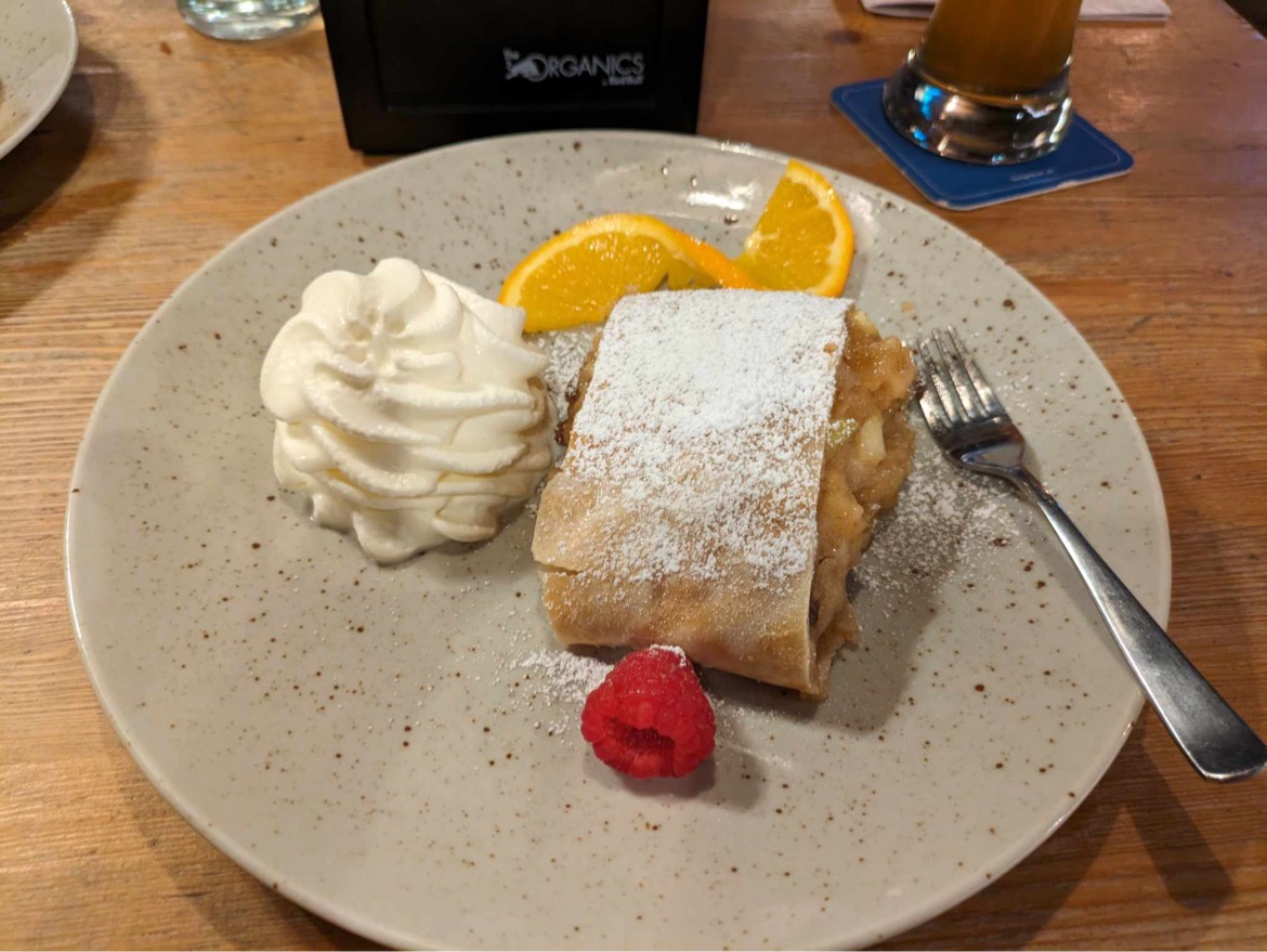 We enjoyed it so much however that we returned today, Tuesday 19 December as a party of 2 and were seated upstairs. From the moment we sat down, the service from the waitress upstairs was unwelcoming, unfriendly and lacking any warmth or interest. She seemed annoyed to have us there, made no suggestions, practically threw our food and drink at us, and after clearing our plates made no offer of dessert or anything else. We had planned to try the apple strudel, however chose instead to leave.