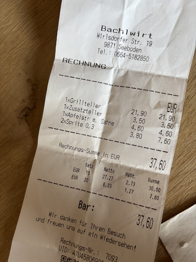Read moreIch frage mich ernsthaft wo die ganzen guten Bewertungen her kommen denn ich habe eigentlich keine gehobenen Ansprüche. Evtl hatten wir einfach nur richtig viel Pech an dem Tag. War auf der Durchreise mit der Familie (2 Erwachsene + 2 Kinder unter 8 Jahren) hier Mittags essen und kann nichts positives erwähnen. Keine Begrüßung oder ähnliches. Generell fühlten wir uns bei der Bedienung nicht wirklich willkommen und wurden recht kaltherzig bedient. Wenn die Kinder schon fragen was die Frau denn hat sagt das schon ziemlich viel aus. Essen haben wir 2x Schnitzel, Spaghetti Bolognese und einen Bachlwirt Teller bestellt. Schnitzel war wohl das schlechteste was ich bisher bekommen habe. Geschmacklich ununtertoffen und wirklich strohtrocken. Preise stimmen auch nicht mit der Karte auf der Homepage überein! Das Schnitzel vom Schwein kostet laut Karte online 11,50 und vor Ort zahlt man 18€ was ich auch gerne für ein gutes Schnitzel bezahlen würde. Die Pommes als Beilage konnte man aber wenigstens essen. Die Bolognese mag Geschmackssache sein, aber von uns Vier wollte nach dem probieren keiner was davon haben. Der Bachlwirt Teller (bestehend aus viel zu weicher Tagliatelle, Champions und Schweinemedaillons) war aufgrund der Sauce die man mit Maggi Fix besser hin bekommen hätte leider auch nicht dem Preis entsprechend und konnte so nicht gegessen werden. Zahlung zum Schluss dann nur in Bar möglich. Für mich zwar nicht tragisch, aber wie das am Nebentisch den Gästen gegenüber kommuniziert wurde ist eigentlich eine Frechheit. Schlussendlich wäre ein Besuch einer willkürlich gewählten Autobahnraststätte schmackhafter und wohl auch freundlicher gewesen. Ich hoffe der Betreiber versucht sich zu verbessern, denn so ist das Lokal nicht...