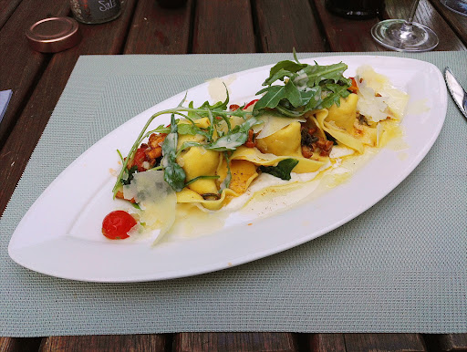 Read more4,7 sterne für?? Carpaccio ist normalerweise ein Traum aber wie kann man das gute Fleisch mit so viel Soße verhauen. Da geht der ganze Geschmack vom Fleisch unter. Und was war da noch drauf? Rotkraut? Ugh. Ging gar nicht. Aber das ist eh die Entscheidung des Koches. Aber was mich eigentlich wirklich so aufregte das ich diese Rezession schreibe war das wir eben die Vorspeise bekamen, währendessen kamen 2 Tische neben uns. Die rechts von uns bekamen auch ein Vorspeise wo wir schon fertig waren, die links von uns ein 4 Gänge Menü. Links aß die Vorspeise und bekamen die Hauptspeise, rechts waren sie schon beim 2. Gang. Wir warteten. Bestellten einen Melot. Kellner schank 3 mal bei uns nach während links die restliche Pizza schon einpackte und rechts schon aufgedeckt wurde. Dann sagten wir zahlen, er drehte sich um schaute verwirrt und meinte unsere Pizza kommt ja noch. Wir sagten mach 40minuten braucht sie nicht mehr kommen. Er ging rein kam zurück und entschuldigte sich das die Bestellung nicht in der Küche ankam. Und es kam weder der Chef zum Entschuldigen noch kam ein Entschuldigungsdessert. Und 1. Stern vergeb ich nur weil man einen geben muss