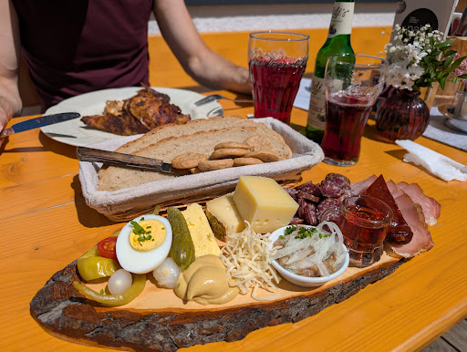 Wunderschönes Platzl hoch über dem Inntal. Bei traumhaftem Winterwetter noch schöner. Klarerweise sehr starker Gästeandrang, sodass die selber installierte Sonnenterrasse im Tiefschnee auch ihren Reiz entfaltet. Blöd nur, dass das Diesel- Strom-Aggregat die Bergluft verpestet, unangenehm auch der Topfenstrudel, der tagelang neben Zwiebel, Graukäs und Co gelagert worden sein dürfte... er hat jedenfalls so geschmeckt. Schade.