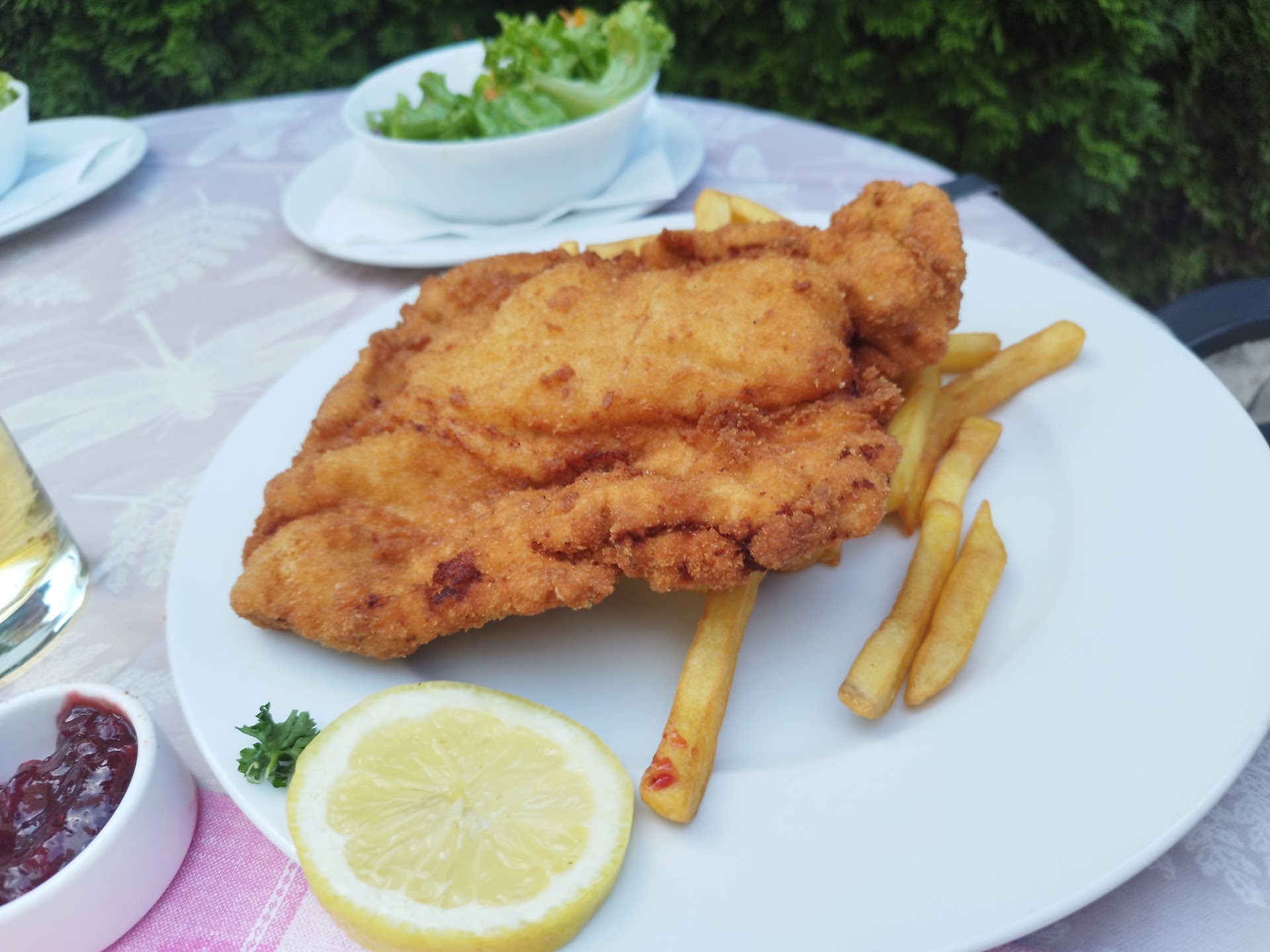 Jeder unserer bisherigen Besuche bot stets eine besondere lukullische Überraschung. Am Samstag, 13. Aug., war dies das Eierschwammerl Gulasch mit Semmelknödel, begleitet von mild mariniertem grüner Salatvariation. Zum Dessert wurden uns Topfenknödel mit Schwarzbeeren Füllung auf Früchtespiegel dargeboten. Will man, wie ich, keine süße Nachspeise, stehen Suppen zur Auswahl. Zum täglich wechselnden Menü gibt es auch das Wochenmenü. A là carte lohnt sich der Blick in die umfangreiche Speisekarte.