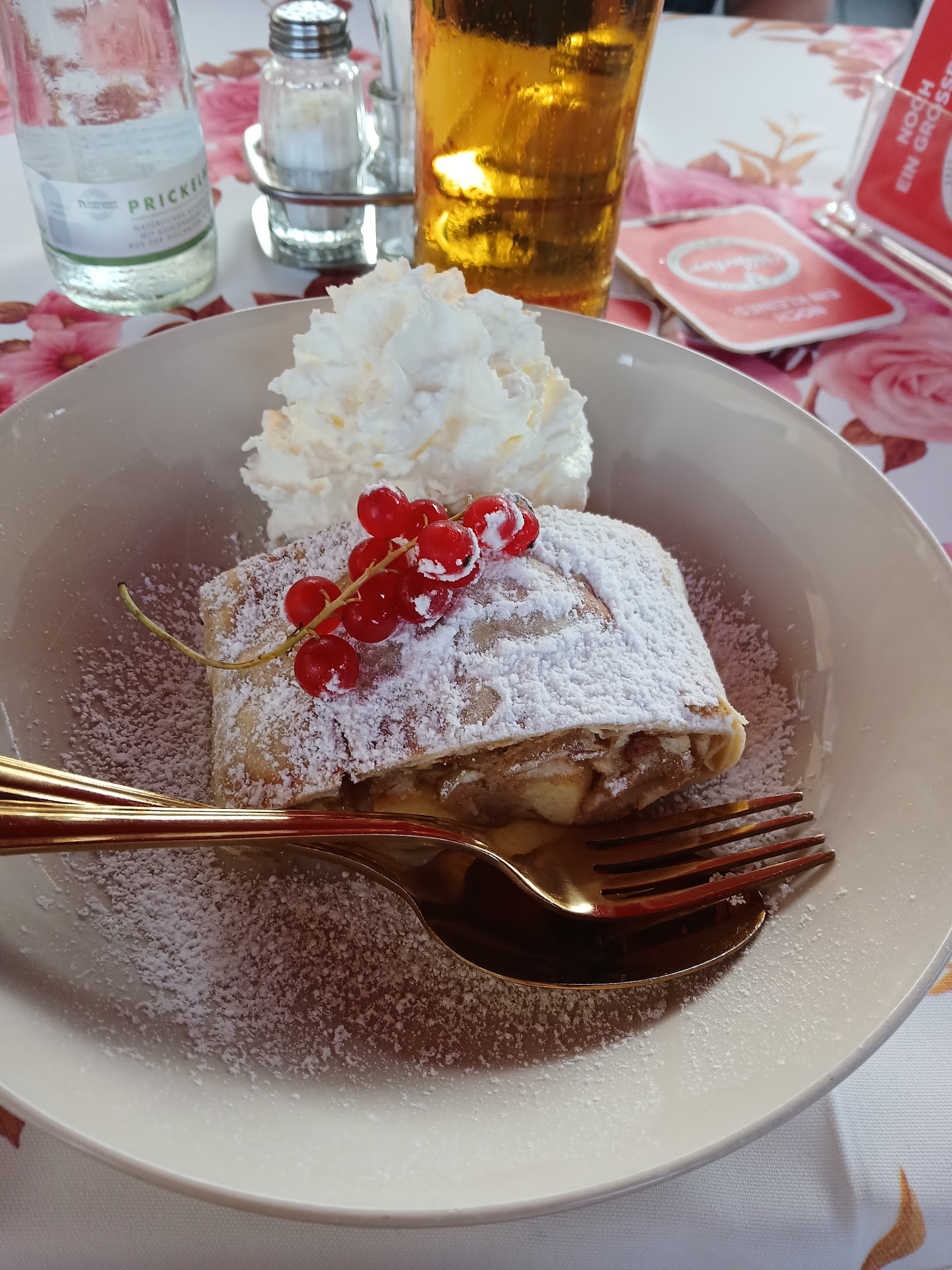Jeder unserer bisherigen Besuche bot stets eine besondere lukullische Überraschung. Am Samstag, 13. Aug., war dies das Eierschwammerl Gulasch mit Semmelknödel, begleitet von mild mariniertem grüner Salatvariation. Zum Dessert wurden uns Topfenknödel mit Schwarzbeeren Füllung auf Früchtespiegel dargeboten. Will man, wie ich, keine süße Nachspeise, stehen Suppen zur Auswahl. Zum täglich wechselnden Menü gibt es auch das Wochenmenü. A là carte lohnt sich der Blick in die umfangreiche Speisekarte.