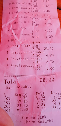 Read moreKamen für einen leckeren Kaisersmarrn. Auf die Frage ob er selbstgemacht sei, antwortete der Wirt frech: "Was glaubt denn ihr, was meine Frau in der Küche macht?" Daraufhin wurde bestellt - allerdings nicht mehr vom Wirt selbst serviert. Ein Paraktikant brachte das "Essen": aufgetautes Mikrowellenessen der Marke Iglo. Jedes stück Kaisersmarrn sah gleich aus und wurde von einer gehörigen Portion Staubzucker bedeckt. Der Geschmack war wie man ihn von einem Fertigteig kennt-furchtbar! Nicht einmal in der Pfanne hatte man ihn aufgewärmt, das Essen kam frisch aus der Mikrowelle und war an manchen Stellen viel zu heiß. Wenn ich...