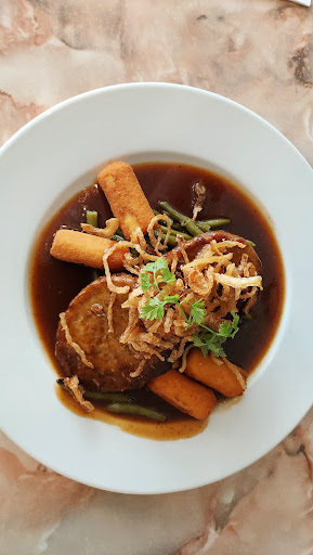 Es gibt eine kleine Auswahl an veganen und laktosefreien Gerichten, das Essen ist gut und wurde passend temperiert serviert.