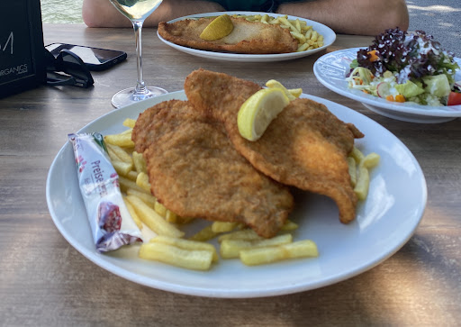 We got here thinking we found a nice place near the lake, with the view on the floating stage, but quickly we realised our bad choice. The waiter welcomed us with a rush of saying what we want to drink and eat, not friendly et all and not giving much explanations, so take your time to ask your questions. Not customer oriented, rather money oriented and a tourist trap, you’re paying for the location and the view. Being in Austria one or twice in a year we like to go for a local schnitzel, but this one here was the biggest disappointment ever. Dry piece of cardboard, coming together with the same cardboard fries and the sauce in a plastic bag, want some veggies? No problem, promoted as it would come with it, but of course is not! Our surprise when we got the check, we even had to pay for the sauce separately, which was of course barely 15g/ bag and we asked for more, thinking it would just be included in the price for a 30€ schnitzel. Extremely expensive for this bad quality food. When the waiter asked how is everything and we said it’s not good, she was somehow confirming the bad quality, telling us somehow sarcastically and rude that if she would be in the kitchen, we would have the best schnitzel. Not helping et all, but the food was clearly not fresh, the meat tasting sour and frozen fries coming with it got stone hard, not to mention that the salad that we obviously overpaid, had gross combinations and dressings. The breading of the schnitzel tasted old and odd. Paid for a lunch for 2 and 2 glasses of wine more than 90€, a joke! The mushroom starter soup was very nice tho, that’a what the star is for. 🙂 don’t get tricked of the picture attached, we also got excited seeing it, but once you dig in, you can quickly tell is not the real deal. If you are looking for quality food, go to a restaurant, this place cannot be called that way. It’s a shame for their beautiful position, but its not worth spending a dime...