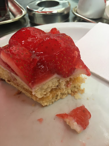 Man sitzt ganz nett draußen und das ist sicherlich einen Stern wert. Wenn der Kellner da ist ist er auch recht freundlich. Es sei denn man stört sich an der Aussage "gehen Sie reinschauen was wir an Kuchenauswahl haben". Nun dem sind wir nachgekommen und haben Erdbeertorte bestellt. 4€ Sie ist leider schon länger in der Auslage gestanden dadurch war der Biscuit sehr trocken und hart. Der Kaffe dazu schmeckte leider nicht . Entweder war es eine schlechte Bohne oder die Maschine die für seh bitteren Geschmack sorgte ohne das er dabei Stark war.