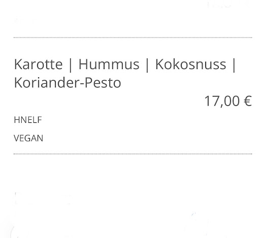 Read moreIn den Biergläsern war zunächst noch je ein Schlückchen Spülwasser - das mussten wir erstmal im nächstgelegenen Blumentopf entsorgen. Salate und Suppe waren lecker, aber nicht besser als wir das zu Hause selber können. Den Brotkorb, den alle anderen Tische zu den Vorspeisen bekommen hatten, hat man uns unterschlagen. Nach Reklamation haben wir den dann doch noch bekommen und das Brot war richtig lecker - was es irgendwie noch schlimmer gemacht hat. Wir hätten das Brot eben gerne ZU den Vorspeisen gehabt und nicht hinterher. Die drei Hauptgerichte sind nur lauwarm bei uns angekommen. Am Nebentisch haben sie dasselbe Problem gehabt. Das Personal war freundlich, aber möglicherweise überfordert. Da hat uns dann das cool/sterile Ambiente auch nicht mehr überzeugt. Die Speisekarte wirkt z.T. eher abschreckend. „Karotte / Hummus / Kokosnuss / Koriander-Pesto“ - das soll ein Hauptgericht sein? Das liest sich doch eher wie eine...
