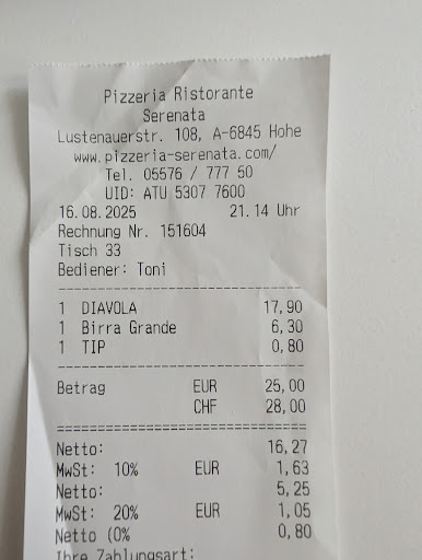 Neuer Tag, neuer Versuch - Ergebnis leider gleich oder gar noch übler: Ich war kürzlich vor Ort und wollte eigentlich eine Pizza im Lokal essen, in der Hoffnung, dass die Preise wieder/noch hinnehmbar seien. Doch eine Pizza für € 19.90?! Geht's eigentlich noch?! Das ist ganz sicher nicht auch nur ansatzweise mit 'gestiegenen Kosten' zu rechtfertigen. Das ist nur noch dreist und einfach traurig, wenn man denkt, wie gut und vor allem fair die Speisekarte der Pizzeria Serenata früher (bis ca. 2020) mal war. Es tut schon regelrecht weh. Ein Stammlokal weniger, in das wir wohl nie wieder gehen werden. Ihr habt durch diese Gier soeben gute (ehemalige Stamm)Kunden verloren; wir sind eine sehr grosse Familie mit beeindruckender Reichweite.