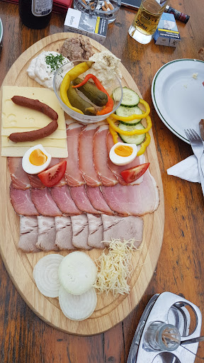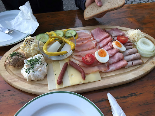 Wir saßen draußen und konnten somit noch den schönen Sonnenuntergang beim Essen begutachten. Zu essen gab es für mich und meinen Partner eine Brettljause für zwei Personen. Da war auf jedenfall ordentlich was drauf und sehr schön hergerichtet! (Siehe Bild)